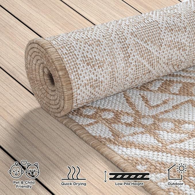 Dank wetterfester und UV-beständiger Eigenschaften eignet sich der Teppich sowohl für Wohnräume als auch für Balkon und Terrasse. Kurzflor (5 mm) verhindert das Festsetzen von Schmutz.