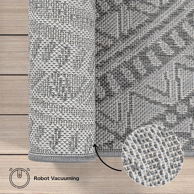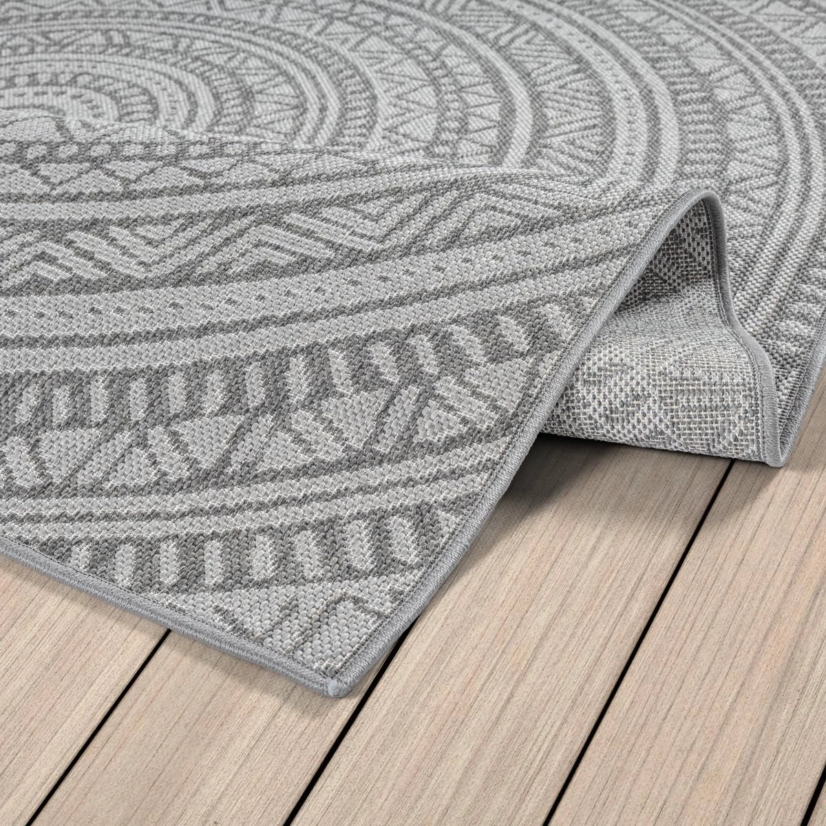 Dank wetterfester und UV-beständiger Eigenschaften eignet sich der Teppich sowohl für Wohnräume als auch für Balkon und Terrasse. Kurzflor (5 mm) verhindert das Festsetzen von Schmutz.